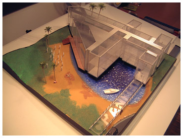 I was asked by Granada TV to design not a set but an entire building for a breakfast show they where pitching to the network Channel 4. I loved the idea that the opening titles could use a helicopter shot over the building that would be shaped as per the number 4. I also put a beach palm trees and lake outside the studio window which was an ironic joke as the building was to be built in rainy Manchester.